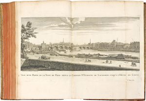 Monumental ouvrage dû à deux bénédictins. Synthèse d’une infinité de documents et d’observations c’est l’histoire de Paris la plus fiable et la plus complète jusqu’alors. Elle reste fondamentale. Frontispice par Hallé, 4 larges en-têtes, très grand plan de Paris plusieurs fois replié et 32 PLANCHES LA PLUPART DOUBLES OU REPLIÉES GRAVÉES EN TAILLE -DOUCE DE MONUMENTS OU DE SITES PARISIENS dues à Chaufourier. On lit sur le titre : " Ce livre appartient à Monsieur le duc de Valentinois ”. Des blasons avec monogramme et couronne ducale sur les plats et les dos sont probablement ceux de cette personnalité.