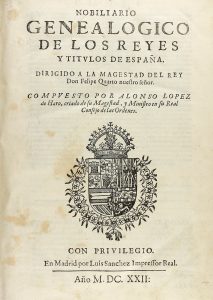 1622. (GENEALOGIA-ESPAÑA). LOPEZ, ALONSO: NOBILIARIO GENEALOGICO DE LOS REYES Y TITULOS DE ESPAÑA. En Madrid: por Luis Sánchez, Impressor Real, 1622. 2 vols. Folio. I: 8h, 596p., 3 h.; II: 532 p., 4 h. Los dos volúmenes con un gran escudo...
