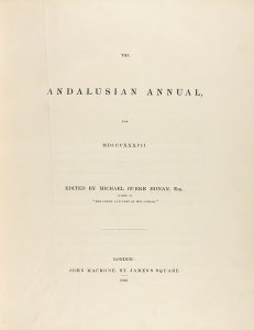 1836. (ANDALUCIA-GRABADOS). BURKE, HONAN [editor]: THE ANDALUSIAN ANNUAL, FOR MDCCCXXXVII. London: John Macrone, 1836. Folio. mayor. II + VIII + 160 p. 2 h. 12 láminas coloreadas a mano. Enc. en plena piel con decoraciones gofradas en seco. Las...