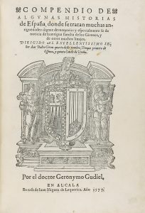 1577. (BRUGALLA-GENEALOGIA). GUDIEL, GERONYMO: COMPENDIO DE ALGUNAS HISTORIAS DE ESPAÑA DONDE SE TRATAN MUCHAS ANTIGUEDADES DIGNAS DE MEMORIAS: y especialmente se da noticias de la antigua familia delos Girones y de otros muchos linajes. Alcala: en...
