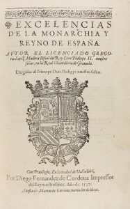 1597. (BRUGALLA). LOPEZ MADERA, GREGORIO: EXCELENCIAS DE LA MONARCHIA Y REYNO DE ESPAÑA. Valladolid: Diego Fernandez de Cordova Imp., 1597. 4º mayor. 16 h. + 84 fol. Escudo real grabado en portada. Texto enmarcado. Viñetas. Enc. por Brugalla, en...