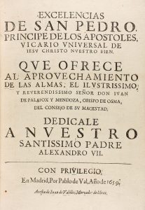 1659. (BRUGALLA). PALAFOX Y MENDOZA, JUAN: EXCELENCIAS DE SAN PEDRO PRINCIPE DE LOS APOSTOLES. En Madrid: por Pablo de Val, 1659. 4º mayor. 1 h. + 40 h., 516 p., 20 h. Frontis calcográfico alegórico y una lámina con en retrato el autor....