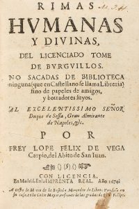 1674. (BRUGALLA-LITERATURA). BURGUILLOS, TOME DE: RIMAS HUMANAS Y DIVINAS DEL LICENCIADO... NO SACADAS DE BIBLIOTECA NINGUNA (QUE EN CASTELLANO SE LLAMA LIBRERIA) SINO DE PAPELES DE AMIGOS, Y BORRADORES SUYOS. Madrid: Imp. Real, 1674. 8º. 8 h. +...