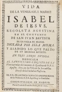 1675. (BRUGALLA). FRANCISCO IGNACIO: VIDA DE LA VENERABLE MADRE ISABEL DE IESUS, RECOLETA AGUSTINA EN EL CONVENTO DE SAN IUAN BAUTISTA DE LA VILLA DE ARENAS. Madrid: por la Viuda Francisco Nieto, 1675. 8º. 16 p. + 470 p., 10 p. Dictada por ella...