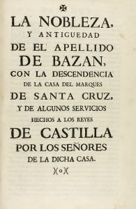 1680 ca. (BRUGALLA). LA NOBLEZA Y ANTIGUEDAD DE EL APELLIDO DE BAZAN, CON LA DESCENDENCIA DE LA CASA DEL MARQUES DE SANTA CRUZ, Y DE ALGUNOS SERVICIOS HECHOS A LOS REYES DE CASTILLA POR LOS SEÑORES DE LA DICHA CASA. S.l.: s.i.n.a. 4º mayor....