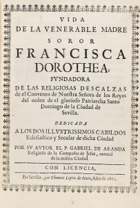 1685. (BRUGALLA). VIDA DE LA VENERABLE MADRE SOROR FRANCISCA DOROTHEA FUNDADORA DE LAS RELIGIOSAS DESCALZAS DE EL CONVENTO DE NUESTRA SEÑORA DE LOS REYES DEL ORDEN DE EL GLORIOSO PATRIARCHA SANTO DOMINGO DE LA CIUDAD DE SEVILLA. Sevilla: Thomas...