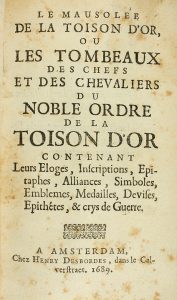 1689. (BRUGALLA). LE MAUSOLEE DE LA TOISON D´OR OU LES TOMBEAUX DES CHEFS ET DES CHEVALIERS DU NOBLE ORDRE DE LA TOISON D´OR. Amsterdam: chez Henry Desbordes, 1689. 8º menor. Portada + 463 p., 4 h. Enc. por Brugalla, en 1942, en plena piel,...