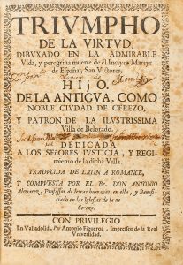 1695 ca. (BRUGALLA). ALVAREZ, ANTONIO: TRIUMPHO DE LA VIRTUD DIBUXADO EN LA ADMIRABLE VIDA, Y PEREGRINA MUERTE DE EL INCLYTO MARTYR DE ESPAÑA, SAN VICTORES HIJO DE LA ANTIGUA, COMO NOBLE CIUDAD DE CEREZO Y PATRON DE LA ILUSTRISSIMA VILLA DE...