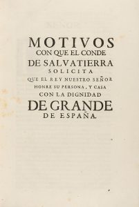 1700 ca. (BRUGALLA). MOTIVOS CON QUE EL CONDE DE SALVATIERRA SOLICITA QUE EL REY NUESTRO SEÑOR HONRE SU PERSONA, Y CASA CON LA DIGNIDAD DE GRANDE DE ESPAÑA. S.l.: s.i.n.a. 4º mayor. 116 p., 2 h. Enc. por Brugalla , en 1942 en plena piel, tejuelo,...