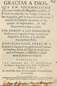 1725 ca. (BRUGALLA). FAXARDO, JUNA; LAGUNO, FRANCISCO: GRACIAS A DIOS QUE EN SOLEMNISSIMO NOVENARIO RINDE A SU MAGESTAD PIADOSA, EL REAL CONVENTO DE SAN FELIPE, ORDEN DE SAN AGUSTIN, POR LA MARAVILLOSA RENOVACION DE SU TEMPLO ABRASSADO, EL DIA...