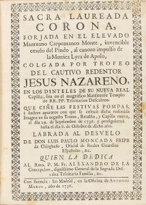 1736. (BRUGALLA-SAN FERMIN). MONCADA, LUIS PAULO: SACRA LAUREADA CORONA, FORJADA EN EL ELEVADO MANTUANO CARPENTANEO MONTE, INVENCIBLE EMULO DEL PINDO, AL CANORO IMPULSO DE LA METRICA LYRA DE APOLO, COLGADO POR TROFEO DEL CAUTIVO REDENTOR JESUS...