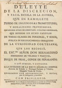 1749. (BRUGALLA-HUMANIDADES). FERNANDEZ DE VELASCO Y PIMENTEL, BERNARDINO: DELEYTE DE LA DISCRECION, Y FACIL ESCUELA DE LA AGUDEZA, QUE EN RAMILLETE TEXIDO DE INGENIOSAS PROMPTITUDES, Y MORALIDADES PROVECHOSAS CON MUCHOS AVISOS DE CHRISTIANO, Y...