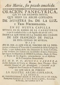 1762. (BRUGALLA-SEVILLA). ORACION PANEGYRICA, QUE EN LAS SOLEMNES FIESTAS, QUE HIZO LA ARCHI-COFRADIA DE NUESTRA Sra. DE LA LUZ, Y TRES NECESIDADES, EN SU NUEVA CAPILLA SITUADA EN EL BARRIO DE LA CARRETERIA ... Sevilla: sa, [1762]. 8º. Capitales y...