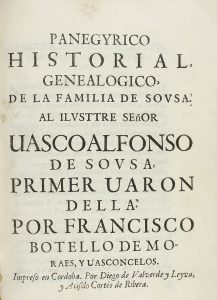 1780 ca. (BRUGALLA-GENEALOGIA). BOTELLO DE MORAES, FRANCISCO: PANEGYRICO HISTORIAL GENEALOGICO, DE LA FAMILIA DE SOUSA. Cordoba: Diego de Valverde y Leyva y Acisclo Cortes de Ribera, s.a. 8º. 5 h. + 45 p., 1 grabados al cobre con las Armas de los...