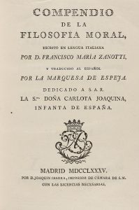 1785. (FILOSOFIA-BRUGALLA). ZANOTTI, FRANCISCO MARIA: COMPENDIO DE LA FILOSOFIA MORAL. Trad. por la Marquesa de Espeja. Madrid: Joaquin Ibarra, 1785. 8º mayor. XII + 256 p. Enc. por Brugalla, en 1955, en media piel, nervios, tejuelo, cortes pintados.