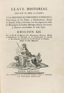 1786. (HISTORIA-BRUGALLA). FLOREZ, HENRIQUE: CLAVE HISTORIAL CON QUE SE ABRE LA PUERTA A LA HISTORIA ECLESIASTICA Y POLITICA. Madrid: Imp. de la viuda Ibarra, 1786. 4º menor. XXXVIII + 447 p. Texto a dos columnas. Enc. por Brugalla, en 1952, en...