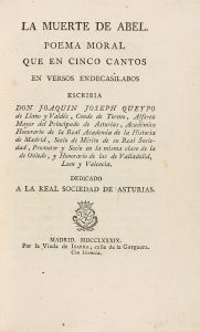 1789. (BRUGALLA-LITERATURA). QUEYPO, JOAQUIN JOSEPH: LA MUERTE DE ABEL. POEMA MORAL QUE EN CINCO CANTOS EN VERSOS ENDECASILABOS ESCRIBIA... Madrid: viuda de Ibarra, 1789. 8º mayor. 5 h. + 129 p. Enc. por Burgalla, en 1955, en media piel, nervios,...