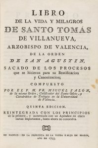 1793. (BRUGALLA-VALENCIA). SALON, MIGUEL: LIBRO DE LA VIDA Y MILAGROS DE SANTO TOMAS DE VILLANUEVA, ARZOBISPO DE VALENCIA DE LA ORDEN DE SAN AGUSTIN SACADO DE LOS PROCESOS QUE SE HICIERON PARA SU BEATIFICACION Y CANONIZACION. Madrid: Imp. de la...