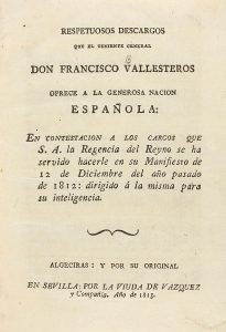 1813. (BRUGALLA). RESPETUOSOS DESCARGOS QUE EL TENIENTE GENERAL DON FRANCISCO VALLESTEROS OFRECE A LA GENEROSA NACION ESPAÑOLA: En contestación a los cargos que S.A. la Regencia del Reyno se ha servido hacerle en su Manifiesto de 12 de Diciembre...