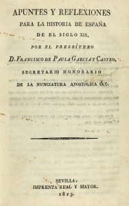 1823. (BRUGALLA-HISTORIA). GARCIA Y CASTRO, FRANCISCO DE PAULA: APUNTES Y REFLEXIONES PARA LA HISTORIA DE ESPAÑA DE EL SIGLO XIX. Sevilla: Imp. Real y Mayor, 1823. 8º. 127 p., 1 h. Leve rasgadura restaurada. Enc. por Brugalla, en 1949, en media...