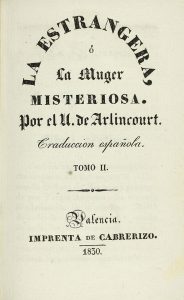 1830. (BRUGALLA). LA ESTRANGERA O LA MUGER MISTERIOSA. Valencia: Librería de Cabrerizo, 1830. 2 vols. en 12º. I: 338 p.; II: 315 p. Papel de hilo. Grabados en las portadas. Encuadernados por Brugalla en 1955 en cartoné, tejuelo.