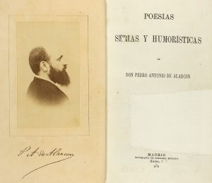 1870. (BRUGALLA). ALARCON, PEDRO ANTONIO DE: POESIAS SERIAS Y HUMORISTICAS. Madrid: Tip. de Gregorio Estrada, 1870. 8º menor. XL + 300 p., 2 h. Ilustr. con un retrato en albúmina del autor. Enc. por Brugalla, en 1955, en media piel, puntas,...