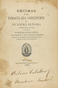 1888. (BRUGALLA). DECIMAS A LA INMACULADA CONCEPCION DE NUESTRA SEÑORA DE DIFERENTES AUTORES. Sevilla: Imp. de E. Rasco, 1888. 8º. 22 p., 1 h. Viñetas. Enc. por Brugalla, en 1940 en plena piel, tejuelo. Escudo del Marqués del Saltillo grabado en...