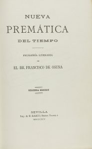 1895. (BRUGALLA). OSUNA, FRANCISCO DE: NUEVA PREMATICA DEL TIEMPO. Sevilla: Imp. de E. Rasco, 1895. 8º menor. XXII hojas. Encuadernado por Brugalla en 1942 en media piel. Tejuelo.