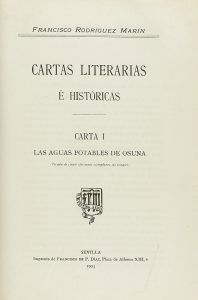 1903. (BRUGALLA-AGUAS-ANDALUCIA). RODRIGUEZ MARIN, FRANCISCO: CARTAS LITERARIAS E HISTORICAS. CARTA I. LAS AGUAS POTABLES DE OSUNA. Sevilla: Imprenta de Francisco de P. Diaz, 1903. 8º mayor. 14 p., 1 h. Encuadernado por Brugalla en 1940, en media...