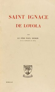1934. (BRUGALLA). DUDON, PERE PAUL: SAINT IGNACE DE LOYOLA. Paris: Gabriel Beauchesne et ses fils edit., 1934. 8º mayor. XX + 663 p. Láms. Enc. por Brugalla, en 1940 en media piel, tejuelo, cortes pintados. Ex-libris del Marqués del Saltillo.
