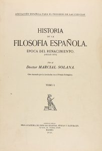 1941. (BRUGALLA-FILOSOFIA). SOLANA, MARCIAL: HISTORIA DE LA FILOSOFIA ESPAÑOLA. Madrid: Real Academia de Ciencias Exactas, 1941. 3 vols. en 4º menor. 700 p. aprox. cada vol. Encuadernados por Brugalla en 1941 en media piel y puntas. Nervios con...