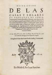 1620. LANA, BRAULIO DE: DESCRIPCION DE LAS CASAS Y SOLARES DE GONZALEZ DE ANDIA, YRARRAÇAVAL, ZARAT, RECALDE, Y BIVERO, CON ALGUNOS DE SUS PRIVILEGIOS... Madrid: por Iuan Sanchez, 1620. 4º mayor. 18 h. + 106 fol. Escudo grabado Enc. de Pedro...