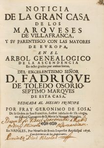 1676. SOSA, GERONIMO DE: NOTICIA DE LA GRAN CASA DE LOS MARQUESES DE VILLAFRANCA Y SU PARENTESCO CON LAS MAYORES DE EUROPA, EN EL ARBOL GENEALOGICO DE LA ASCENDENCIA EN OCHO GRADOS POR AMBAS LINEAS DEL EXCELENTISIMO SEÑOR D. FADRIQUE DE TOLEDO...