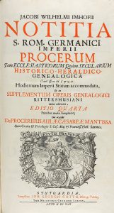 1699. (HERALDICA). WILHELMI IMHOFII, JACOBI: NITITIA S. ROM. GERMANICI IMPERII PROCERUM Iam ECCLESIASTICORUM Quam SECULARIUM HISTORICO-HERALDICO-GENEALOGICA. Stutgardiade: Sumptibus Joh. Georgii Cottae; Typis. Melchoris Gerhardi Lorberi, 1699. Folio...