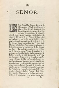 1720 ca. (GENEALOGIA-COLONIZACION PERU). GOMEZ BOQUETE DE MONTEALEGRE, FRANCISCA: PETICION DEL TITULO DE MARQUESA DE MONTEALEGRE DE AULESTIA EN ATENCION A LA NOTORIA CALIDAD, Y NOBLEZA DE LA SUPLICANTE, Y SU DIFUNTO MARIDO Y DE TODOS SUS...