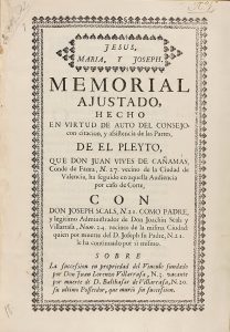 1754. (DERECHO). MEMORIAL AJUSTADO, HECHO EN VIRTUD DE AUTO DEL CONSEJO, CON CITACION Y ASSISTENCIA DE LAS PARTES EN EL PLEYTO QUE DON JUAN VIVES DE CAÑAMAS... HA SEGUIDO CON JOSEPH SCALS... SOBRE LA SUCCESSION EN PROPIEDAD DEL VINCULO FUNDADO POR...