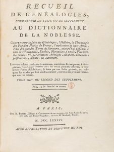 1770-1783. (NOBILIARIA). DICTIONNAIRE DE LA NOBLESSE, CONTENANT LES GÉNÉALOGIES, L´HISTOIRE & LA CHRONOLOGIE DES FAMILLES NOBLES DE FRANCE, L´EXPLICATION DE LEURS ARMES, & L´ÉTAT DES GRANDES TERRES DU ROYAUME AUJOURD´HUI POSSÉDÉES À TITRE...