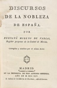 1795. (HERALDICA-MERIDA). MORENO DE VARGAS, BERNABE: DISCURSOS DE LA NOBLEZA DE ESPAÑA. Madrid: en la Imprenta de Don Antonio Espinosa, 1795. 8º mayor. XLVII + 280 p. Encuadernación de época en plena piel. Tejuelo. Cortes pintados. Marco de...