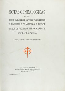 1905. (GENEALOGIA). NOTAS GENEALOGICAS QUE, PARA TOMAR EL HABITO DE SANTIAGO, PRESENTARON D. MARIANO, D. FRANCISCO Y D. RAFAEL PARDO DE FIGUEROA, SERENA, MANSO DE ANDRADE Y PAREJA. Villanueva y Geltrú: por Juan Oliva y Milá, 1905. 107 p., 1 h....