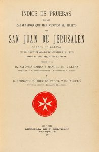 1911. (ORDEN DE MALTA). PARDO, ALFONSO; VILLENA, MANUEL DE: INDICE DE PRUEBAS DE LOS CABALLEROS QUE HAN VESTIDO EL HABITO DE SAN JUAN DE JERUSALEN (ORDEN DE MALTA) EN EL GRAN PRIORATO DE CASTILLA Y LEON DESDE EL AÑO 1514, HASTA LA FECHA. Madrid:...
