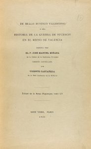 1922. (GENEALOGIA). DE BELLO RUSTICO VALENTINO O SEA ISTORIA DE LA GUERRA DE SUCESION EN EL REINO DE VALENCIA. NY, Paris, 1922. 4º menor. 175 p. Enc. en tela con tejuelo. Ex-libris del Marqués del Saltillo. Restauración en la 1ª hoja.