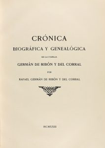 1923. (GENEALOGIA). GERMAN DE RIBON Y DEL CORRAL, GERMAN: CRONICA BIOGRAFICA Y GENEALOGICA DE LA FAMILIA GERMAN DE RIBON Y DEL CORRAL. Alemania: Philipp v. Zabern, 1923. 4º. XII + 189 p. Frontis. Encuadernado por Arias en plena piel con ruedas en...