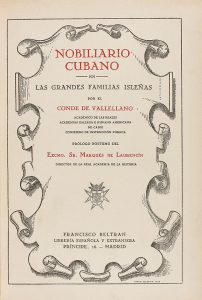 1928 ca. (GENEALOGIA-CUBA-ENCUADERNACION). VALLELLANO, CONDE DE: NOBILIARIO CUBANO. LAS GRANDES FAMILIAS ISLEÑAS. Madrid: Francisco Beltran, sa. (en el diseño de la portada consta 1928). 2 vols. en 4º menor. I: 347 p.; II: 432 p., 1 h. Abundantes...