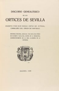 1929. (GENEALOGIA). ORTIZ DE ZUÑIGA, DIEGO: DISCURSO GENEALOGICO DE LOS ORTICES DE SEVILLA. Madrid: 1928 [en portada, 1929 en cubierta]. 4º. 499 p., 8 p. Frontis. Encuadernado por Arias en plena piel con ruedas y escudo dorado en los planos. Lomo...