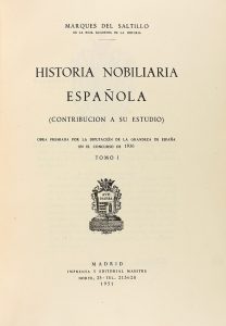 1951. (NOBILIARIA). SALTILLO, MARQUES DEL: HISTORIA NOBILIARIA ESPAÑOLA. Madrid: Imp. y Editorial, 1951. 2 vols. en 4º menor. 600 p. aprox. cada vol. Enc. en media piel y puntas. Edición numerada y limitada a 300 ejemplares. Ofrecemos el num. I...