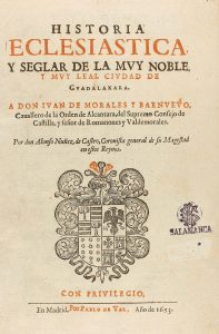 1653. (GUADALAJARA). NUÑEZ DE CASTRO, ALONSO: HISTORIA ECLESIASTICA Y SEGLAR DE LA MUY NOBLE CIUDAD DE GUADALAXARA. Madrid: Imp. Pablo de Val, 1653. 4º mayor. 406 p. + 16 p. y sello estampillado del Marqués del Saltillo uno segundo en portada...