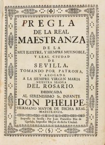 1732. (SEVILLA-CABALLERIA). REGLA DE LA REAL MAESTRANZA DE LA MUI ILUSTRE Y SIEMPRE MUI NOBLE Y LEAL CIUDAD DE SEVILLA, TOMANDO POR PATRON, Y ABOGADA A LA SIEMPRE VIRGEN MARIA DE NUESTRA SEÑORA DEL ROSARIO. Sevilla: Juan Francisco Blas de Quesada,...