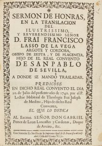 1740. (SEVILLA). LASSO DE LA VEGA, FRANCISCO: SERMON DE HONRAS EN LA TRANSLACION DEL ILUSTRISIMO SR .... HIJO DEL REAL CONVENTO DE SAN PABLO DE SEVILLA. En Sevilla: en la imprenta Real de D. Francisco de Leesdael, 1740. 8º. 14 folios sin numerar +...