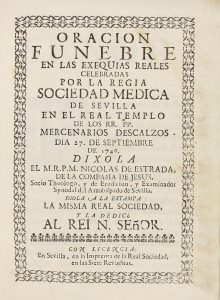1746. (SEVILLA). ESTRADA, NICOLAS: ORACION FUNEBRE EN LAS EXEQUIAS REALES CELEBRADAS POR LA REGIA SOCIEDAD MEDICA DE SEVILLA EN EL REAL TEMPLO DE LOS RR. PP. MERCENARIOS DESCALZOS DIA 27 DE SEPTIEMBRE DE 1746. Sevilla: Imp. de la Real Sociedad,...