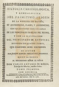 1760. (HISTORIA-ASTURIAS). TRELLES VILLADERMOROS, JOSEPH MANUEL: HISTORIA CHRONOLOGICA, Y GENEALOGICA DEL PRIMITIVO ORIGEN DE LA NOBLEZA DE ESPAÑA, SU ANTIGUEDAD, CLASES Y DIFERENCIAS, CON SUCESSIONES CONTINUADAS DE LAS PRINCIPALES FAMILIAS DEL...